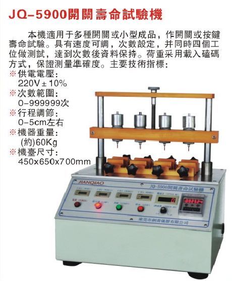 產(chǎn)品型號(hào):JQ-5900 品牌:劍 喬 用途:一、產(chǎn)品介紹: 本機(jī)可對(duì)計(jì)算機(jī)、手機(jī)、記事本等到鍵盤作壽命測(cè)試。適用于多種開關(guān)或小型成品,作開關(guān)或按鍵壽命試驗(yàn),具有速度可調(diào)、次數(shù)設(shè)定,并達(dá)到次數(shù)后數(shù)據(jù)保持. 二、主