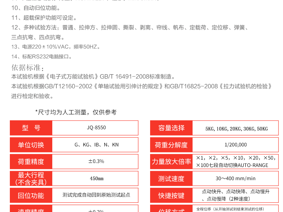 產(chǎn)品型號:JQ-8550 品牌:劍 喬 用途:本系列機廣泛用于各類薄膜、五金、橡膠料、紡織、建材、絕緣體、電線、電纜、端子等各類材料。測試其拉伸、撕裂、穿刺、剝離、抗壓、彎曲、抗剪切、定荷重、定位移、三點抗折